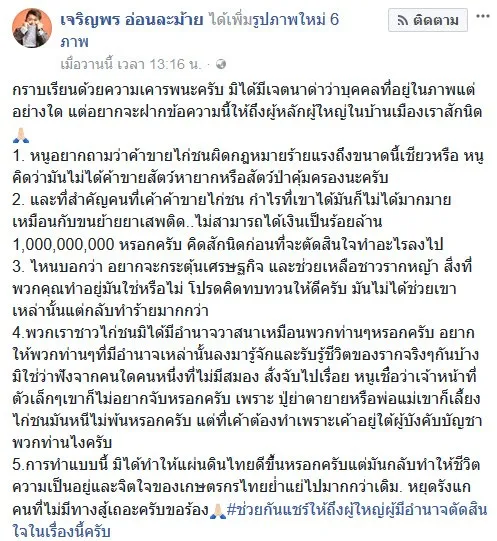 4.พวกเราชาวไก่ชนมิได้มีอำนาจวาสนาเหมือนพวกท่านๆหรอกครับ อยากให้พวกท่านๆที่มีอำนาจเหล่านั้นลงมารู้จักและรับรู้ชีวิตของรากจริงๆกันบ้าง มิใช่ว่าฟังจากคนใดคนหนึ่งที่ไม่มีสมอง สั่งจับไปเรื่อย หนูเชื่อว่าเจ้าหน้าที่ตัวเล็กๆเขาก็ไม่อยากจับหรอกครับ เพราะ ปู่ย่าตายายหรือพ่อแม่เขาก็เลี้ยงไก่ชนมันหนีไม่พ้นหรอกครับ แต่ที่เค้าต้องทำเพราะเค้าอยู่ใต้ผู้บังคับบัญชาพวกท่านไงครับ