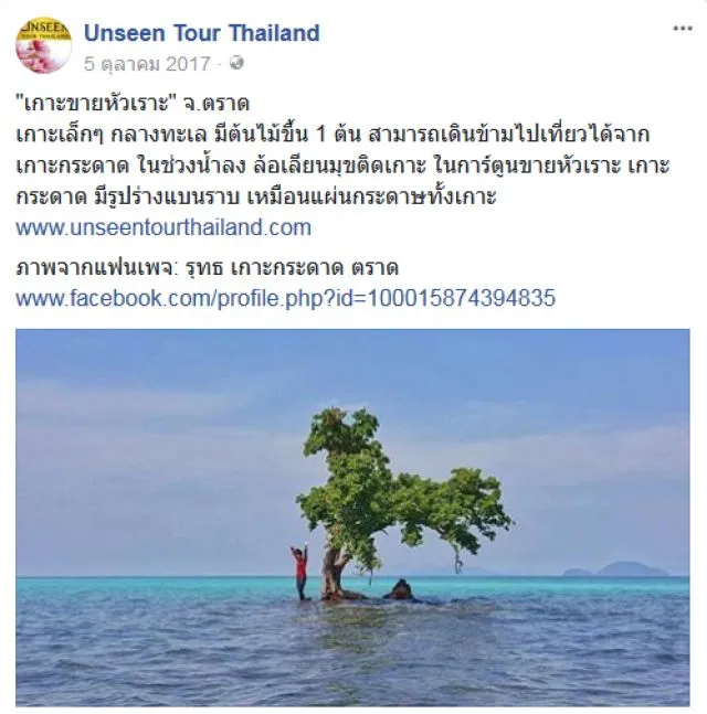 เพจ Unseen Tour Thailand ได้โพสต์เรื่องราว ว่า เกาะที่การ์ตูนขายหัวเราะ มหาสนุก ชอบเล่นแก็กติดเกาะนั้นมีอยู่จริงๆ ภาพถ่ายโดยคุณ รุทธ เกาะกระดาด ตราด ระบุว่า “เกาะขายหัวเราะ” จ.ตราด เกาะเล็กๆ กลางทะเล มีต้นไม้ขึ้น 1 ต้น สามารถเดินข้ามไปเที่ยวได้จากเกาะกระดาด ในช่วงน้ำลง ล้อเลียนมุขติดเกาะ ในการ์ตูนขายหัวเราะ เกาะกระดาด มีรูปร่างแบนราบ เหมือนแผ่นกระดาษทั้งเกาะ
