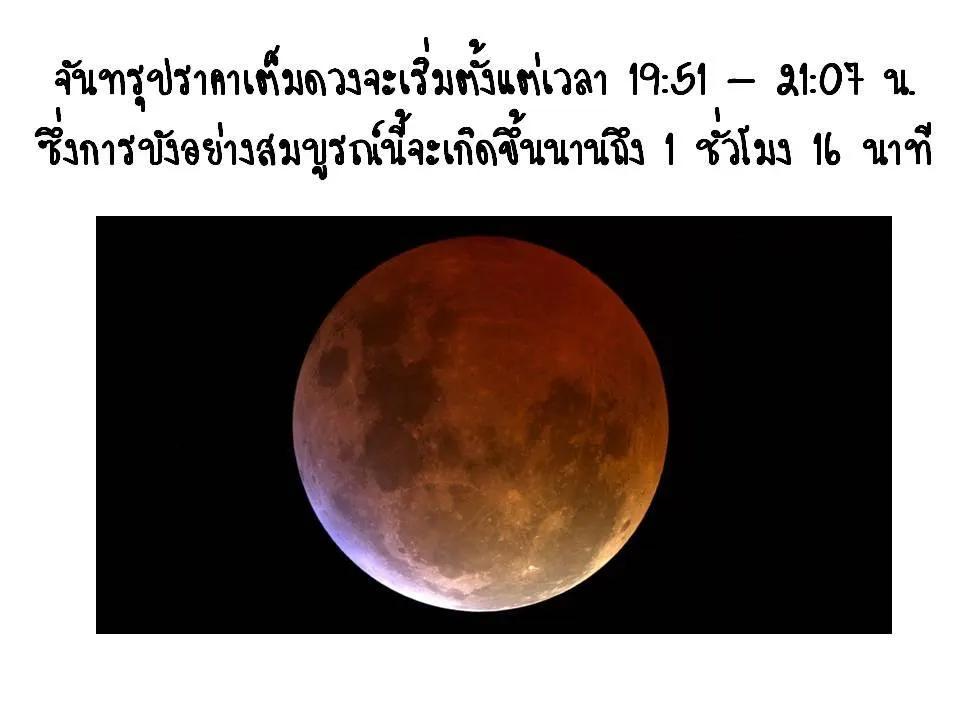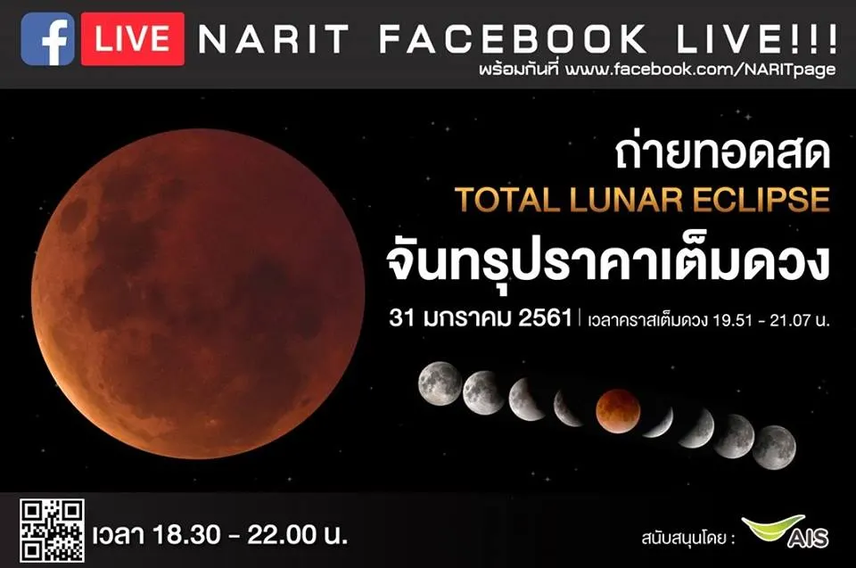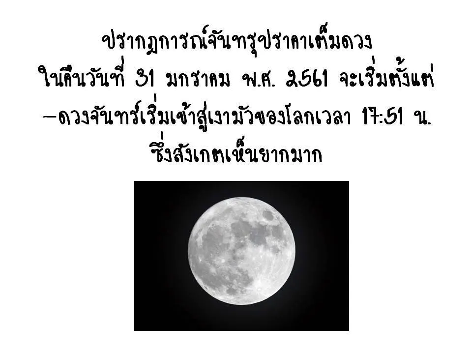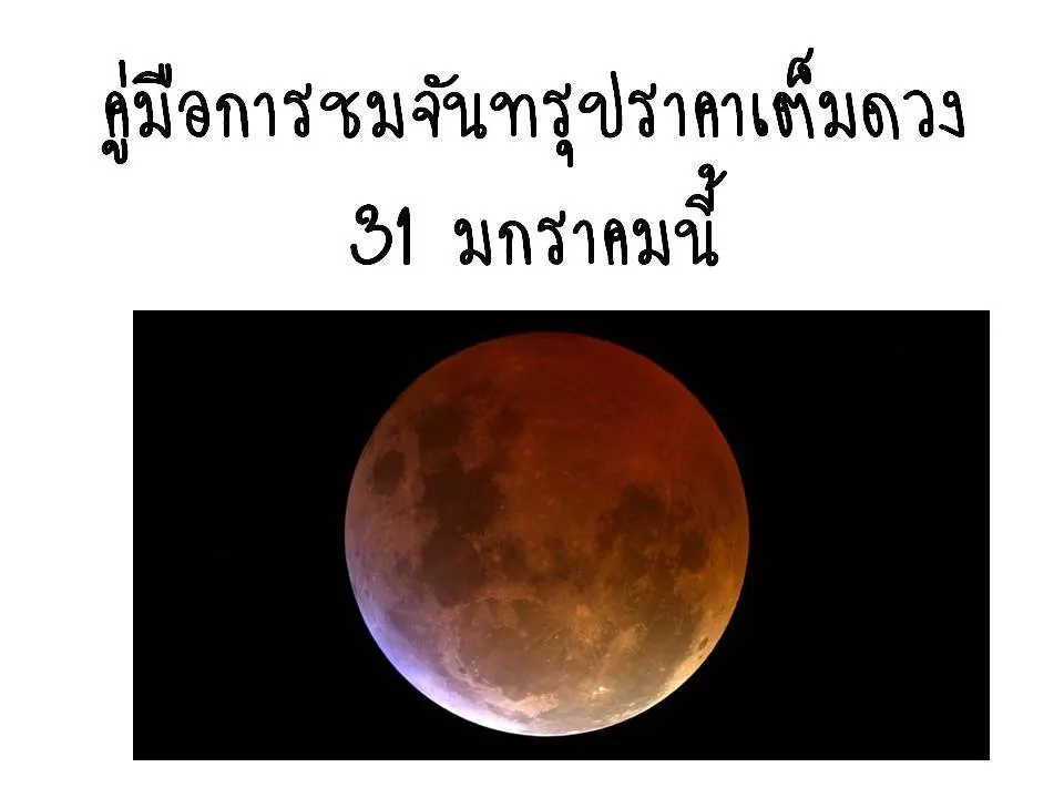 สถาบันวิจัยดาราศาสตร์แห่งชาติ Fan Page โพสท์เฟซบุ๊กเชิญชวยให้ชาวไทยชมพระจันทร์สีเลือดหรือ จันทรุปราคาเต็มดวง ครั้งแรกของปี ในวันที่ 31 ม.ค. 2561 ตั้งแต่เวลาประมาณ 19:51-21:07น. สามารถมองเห็นได้ทั่วประเทศด้วยตาเปล่า ทางทิศตะวันออก ทั้งนี้ยังแนะคู่มือการชมจันทรุปราคาอีกด้วย โดยทางเพจฯ ได้โพสท์ระบุว่า