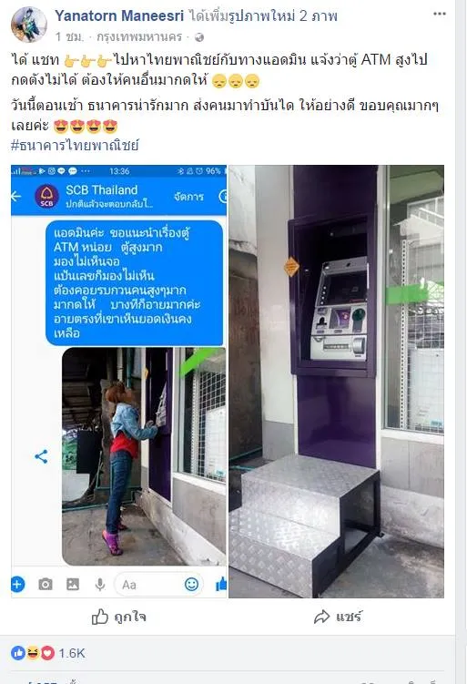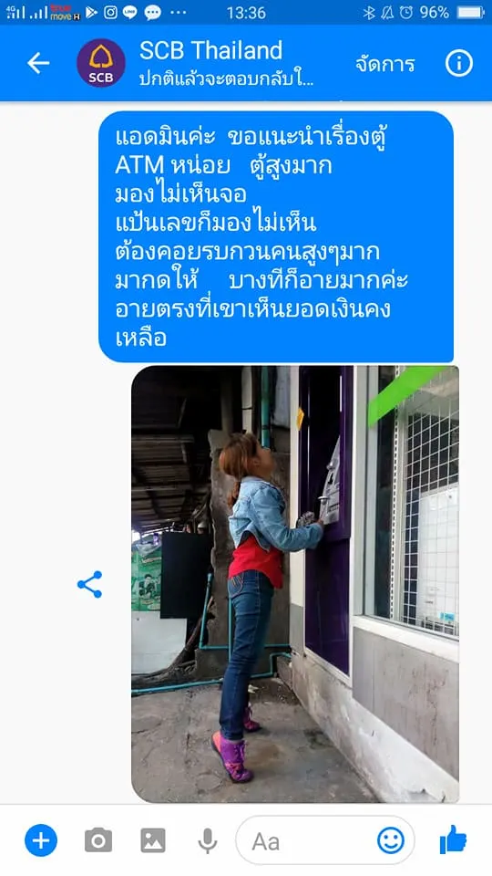 👉ไปหาไทยพาณิชย์กับทางแอดมิน แจ้งว่าตู้ ATM สูงไป กดตังไม่ได้ ต้องให้คนอื่นมากดให้