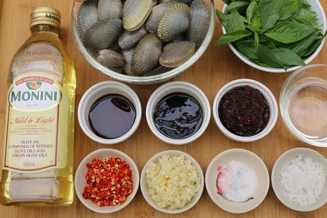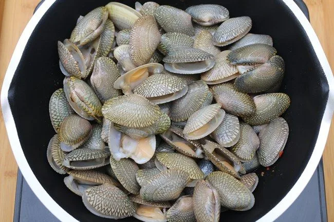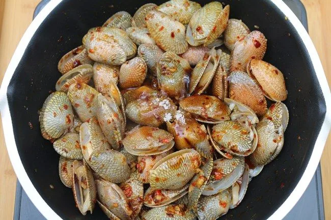 1.นำหอยลายมาล้าง แล้วแช่ในน้ำผสมเกลือป่นทิ้งไว้ 30 นาที เพื่อให้หอยลายคลายดินออกมา