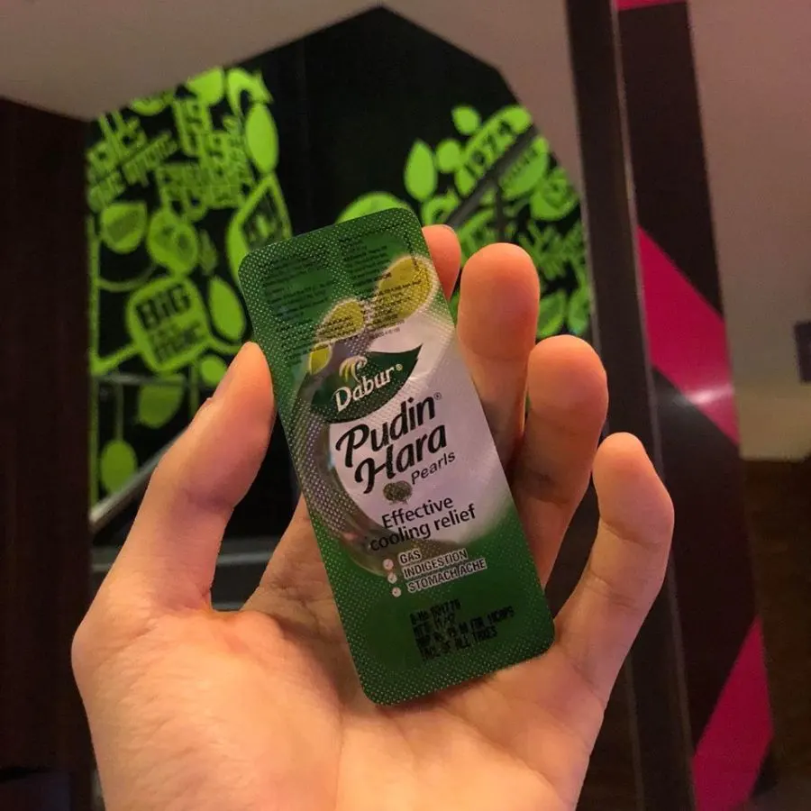 ช่วยบรรเทาอาการปวดท้อง แก๊สในท้อง และอาหารไม่ย่อยด้วยวิธีธรรมชาติ หลังจากทานเข้าไปแล้วสักพัก จะเริ่มเรอออกมาเป็นกลิ่นมิ้นท์ ซึ่งมีคุณสมบัติในการบรรเทาอาการท้องอืด แน่นท้องจากอาหารไม่ย่อยได้เร็วและจะรู้สึกเย็นท้อง บางคนเลอออกมาเป็น รสมิ้นๆ เป็นยาสมุนไพรจากประเทศอินเดีย Pudin Hara Pearls เป็นเม็ดสีเขียวใสขนาดจิ๋ว บรรจุสารสกัดจากสมุนไพรชื่อ pudina (บ้านเราเรียกสะระแหน่หรือมิ้นต์ ) สรรพคุณ เป็นยาช่วยย่อยสำหรับผู้ที่กินมากแล้วปวดท้อง หรือปวดท้องแบบมีลมในกระเพาะ ช่วยย่อย ลดการจุกเสียด ดับกลิ่นอาหาร วิธีใช้ รับประทานครั้งละ 1-2 เม็ด หลังอาหาร ถ้าน้ำหนักมากกว่า 60 กก. ควรทาน 2 เม็ด พยายามอย่าเคี้ยวเพราะกลิ่นมิ้นต์เผ็ดแรงมากๆ หลังจากกลืนไปแล้วสักพักจะรู้สึกเย็นที่ท้อง บางคนจะรู้สึกว่าเรอออกมาเป็นกลิ่นมิ้นต์ บางคนก็อาจจะมีการผายลมได้