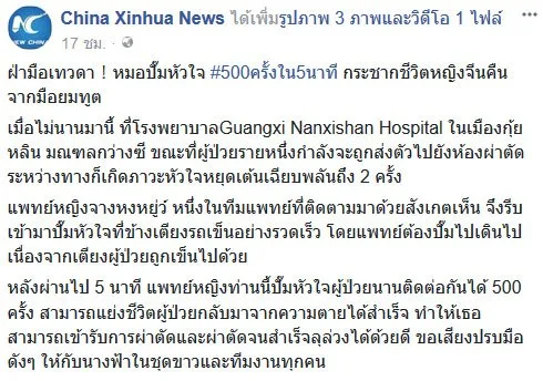 หลังผ่านไป 5 นาที แพทย์หญิงท่านนี้ปั๊มหัวใจผู้ป่วยนานติดต่อกันได้ 500 ครั้ง สามารถแย่งชีวิตผู้ป่วยกลับมาจากความตายได้สำเร็จ ทำให้เธอสามารถเข้ารับการผ่าตัดและผ่าตัดจนสำเร็จลุล่วงได้ด้วยดี ขอเสียงปรบมือดังๆ ให้กับนางฟ้าในชุดขาวและทีมงานทุกคน