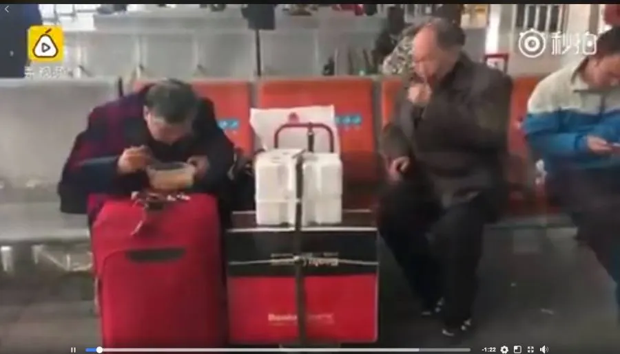 เมื่อผู้สื่อข่าวเข้าไปสอบถามจึงทราบว่า พวกเขากำลังจะนั่งรถไฟไปหาลูกสาวที่กว่างโจว เพื่ออยู่ด้วยกันในช่วงเทศกาลตรุษจีน เนื่องจากลูกสาวงานยุ่งจนกลับบ้านไม่ได้ และพวกเขาทำเช่นนี้เป็นประจำทุกปี ซึ่งสวนทางกับคนส่วนใหญ่ที่คนรุ่นใหม่จะเดินทางออกจากเมืองใหญ่เพื่อกลับบ้านช่วงตรุษจีน