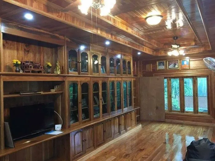 และที่สำคัญ จะจัดมุมพักผ่อนด้วยโซฟานั่งเล่น สีดำซึ่งตัดกับสีของงานไม้ได้อย่างดี มีตู้วางทีวีวางของใช้ ตู้โชว์ได้อย่างเรียบร้อยเป็นระเบียบ