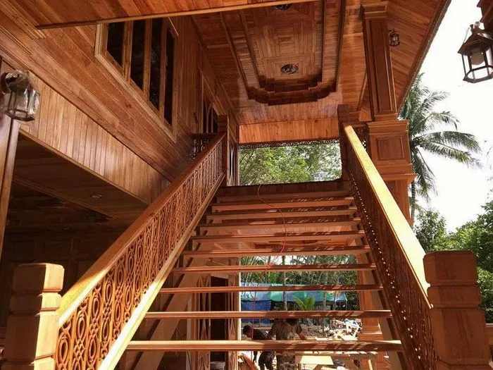 โดยทำระเบียงเป็นที่นั่งเล่น พักผ่อนได้สบาย โดยรวมดูมีสเน่ห์มากทีเดียว ระเบียงไม้ แกะสลัก ฉลุลวดลายสวย เพิ่มความสวยงามได้อย่างน่ามอง