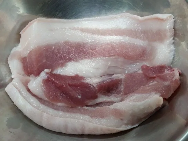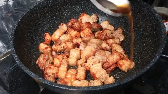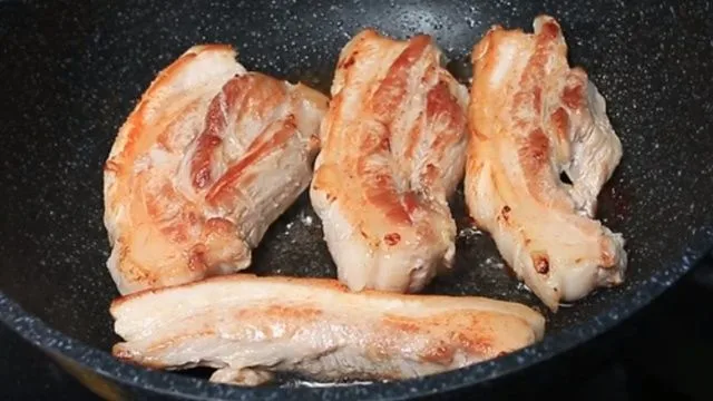 ตัดหนังออก แล้วตั้งกระทำไฟกลางเพราะหมูจะได้สุกทั่ว ไม่ไหม้เสียก่อน เอาหมู3ชั้นลงกระทะ ย่างให้ข้างนึงสุกก่อนแล้วกลับอีกด้าน กลับไปกลับมา รีดน้ำมันออก พอนำมันออกเกือบหมดแล้วใช้กรรไกรตัดเป็นชิ้น แล้วเทน้ำมันออก เหลือไว้นิดนึงแล้วใส่น้ำปลาประมาณ 2 ช้อน เดี๋ยวจะเค็ม..คลุกให้เข้าเนื้อก็เป็นอันเสร็จ