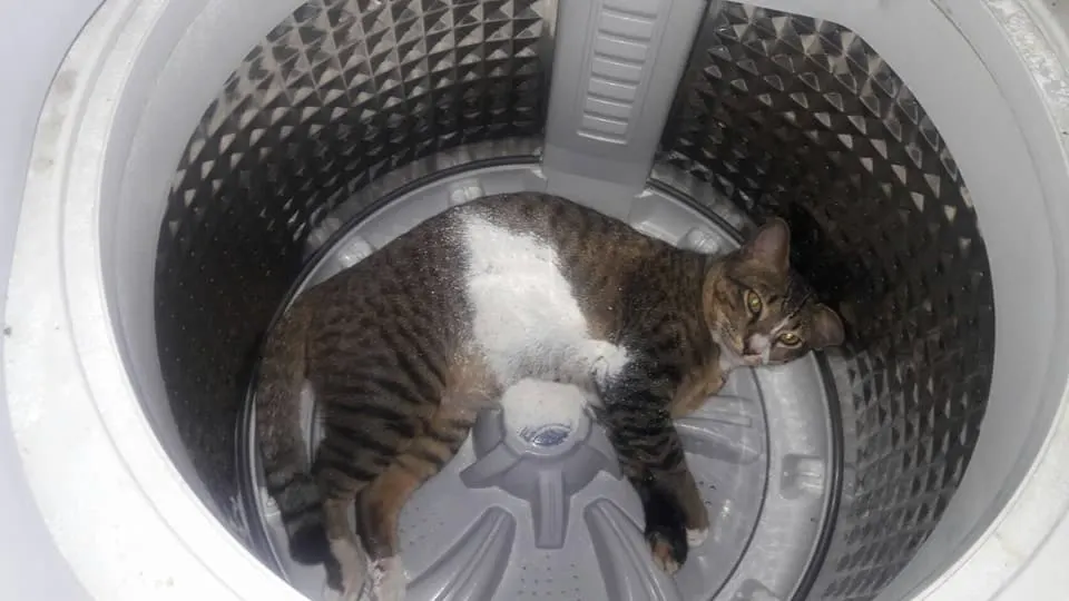 อุ๊ยตายว๊ายกรี๊ด!! แม่กำลังจะซักผ้า แต่พอดูในถัง เจ้าตัวนี้ลงไปนอนอย่างสบายอารมณ์ เกือบได้เป็นแมวปั่นแล้ว