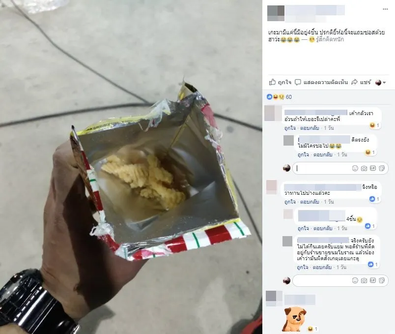 สมาชิกเฟซบุ๊กท่านหนึ่งที่โพสต์ภาพขนมยี่ห้อหนึ่ง พร้อมระบุว่า “แกะมามีแค่นี้ มีอยู่ 4 ชิ้น ปกติยี่ห้อนี้ ฮาว่ะ”