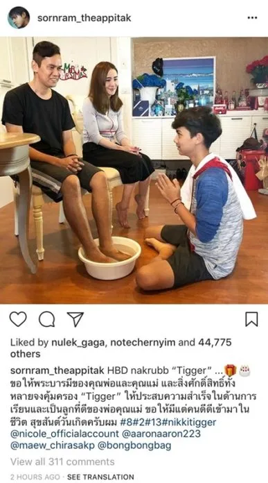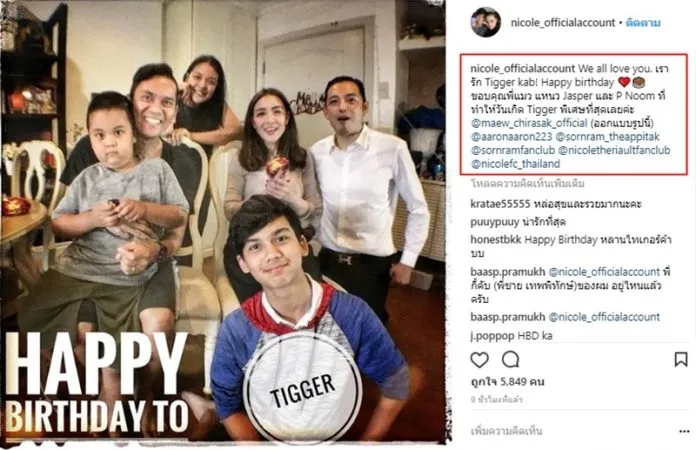 น้องทิกเกอร์ลูกชายหัวแก้วหัวแหวนของ นิโคล ที่มีลูกกับอดีตสามี คุณแมว จีระศักดิ์ นักร้องและนักแต่งเพลงชื่อดัง ได้ทำการล้างเท้าคุณพ่อและคุณแม่ เนื่องในวันเกิด วันที่ 9 ก.พ.ที่ผ่านมา โดยนิโคล ได้บันทึกคลิปนาทีสุดซึ้งนี้ลงใน IG ด้วย โดยโพสท์ระบุว่า “Happy birthday my son. เป็นเด็กดีอย่างนี้ตลอดไปนะครับ @maew_chirasak_official @aaronaaron223 @sornram_theappitak @pongponghat”