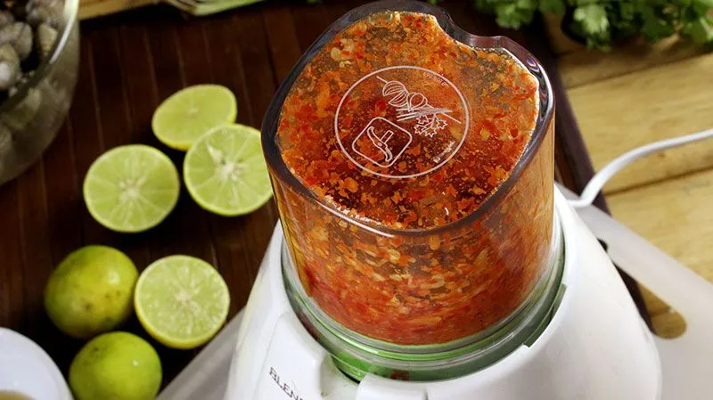 • บ้านใครมีครกก็ใช้ครกโขลกเข้าไปแต่ถ้าใครอยากทุ่นแรงใช้เครื่องปั่นก็ปั่นโลด! แต่การโขลกจะได้ความหอมและรสสัมผัสดีกว่าปั่น ขั้นตอนนี้ปั่นแค่กระเทียมกับพริกอย่างเดียวนะ ห้ามใช้ทางลัดบีบมะนาว น้ำตาล น้ำปลา แล้วปั่นไปพร้อมกันเป็นสมูทตี้ 555+