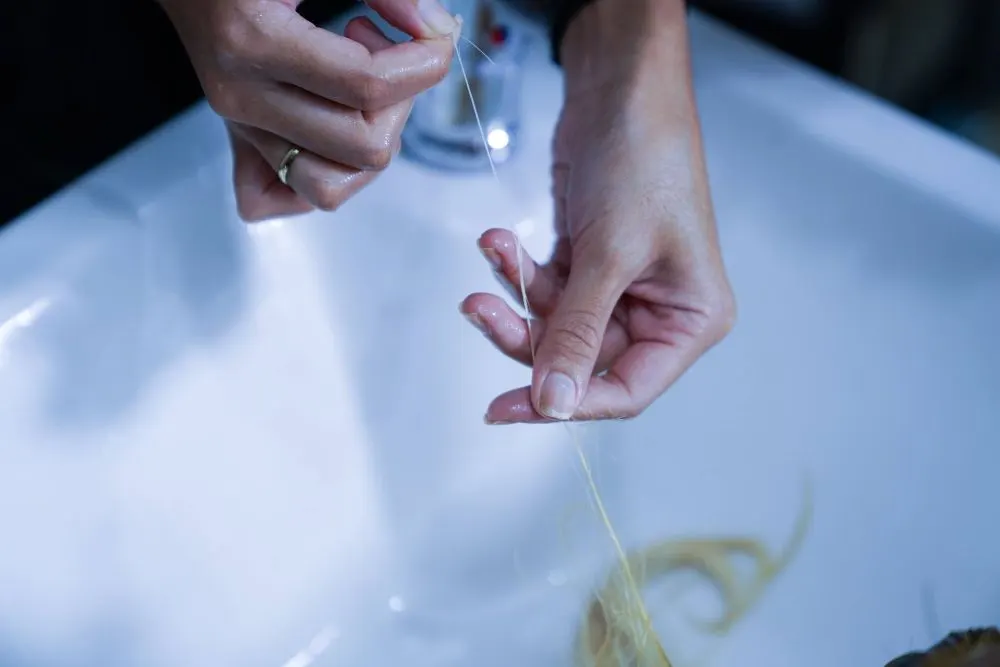 2. มัดผมให้เป็นปม เทคนิคง่ายๆ เพื่อทดสอบความนุ่มลื่นของเส้นผม เพียงแค่แบ่งช่อผมออกมาหนึ่งช่อเล็ก ผูกปลายผมเป็นปม ดึงให้อยู่ตัว ถ้าปมเส้นผมหลุดและคลายตัวออกง่ายดายแสดงว่าผมมีสุขภาพที่ดี เรียบลื่น และมีความยืดหยุ่น แต่หากเส้นผมไม่คลายตัว จับกันเป็นปมแน่น แสดงว่าผมแห้งเสีย หยาบกระด้างแน่นอน