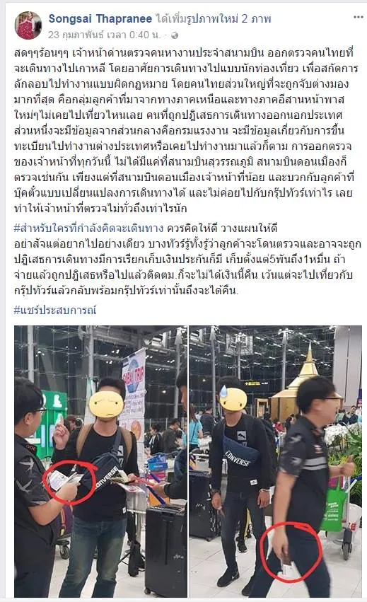 สดๆๆร้อนๆๆ เจ้าหน้าด่านตรวจคนหางานประจำสนามบิน ออกตรวจคนไทยที่จะเดินทางไปเกาหลี โดยอาศัยการเดินทางไปแบบนักท่องเที่ยว เพื่อสกัดการลักลอบไปทำงานแบบผิดกฏหมาย โดยคนไทยส่วนใหญ่ที่จะถูกจับต่างมองมากที่สุด คือกลุ่มลูกค้าที่มาจากทางภาคเหนือและทางภาคอีสานหน้าพาสใหม่ๆไม่เคยไปเที่ยวไหนเลย คนที่ถูกปฎิเสธการเดินทางออกนอกประเทศ ส่วนหนึ่งจะมีข้อมูลจากส่วนกลางคือกรมแรงงาน จะมีข้อมูลเกี่ยวกับการขึ้นทะเบียนไปทำงานต่างประเทศหรือเคยไปทำงานมาแล้วก็ตาม การออกตรวจของเจ้าหน้าที่ทุกวันนี้ ไม่ได้มีแค่ที่สนามบินสุวรรณภูมิ สนามบินดอนเมืองก็ตรวจเช่นกัน เพียงแต่ที่สนามบินดอนเมืองเจ้าหน้าที่น้อย และบวกกับลูกค้าที่บุ๊คตั๋วแบบเปลี่ยนแปลงการเดินทางได้ และไม่ค่อยไปกับกรุ๊ปทัวร์เท่าไร เลยทำให้เจ้าหน้าที่ตรวจไม่ทั่วถึงเท่าไรนัก