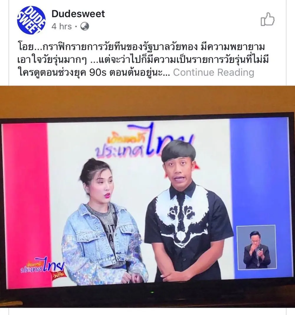 โซเชียลวิจารณ์ทีมโปรดักชั่นรายการ เดินหน้าประเทศไทยวัยทีน ที่เอาใจกลุ่มวัยรุ่น ให้เข้าถึงข่าวสารของรัฐบาล แต่ว่างานกราฟิกนั้นดูจะโบราณไปนิด เกรงว่าจากวัยทีนจะเป็นวัยทองแทนซะนี่ แนะให้จ้างเอกชนทำดีกว่าไหม? หรือว่ายังไม่โดนใจวัยรุ่น? โดยทางเฟซบุ๊กเพจ Dudesweet ได้โพสท์ระบุว่า โอยกราฟิกรายการวัยทีนของรัฐบาลวัยทอง มีความพยายามเอาใจวัยรุ่นมากๆ แต่จะว่าไปก็มีความเป็นรายการวัยรุ่นที่ไม่มีใครดูตอนช่วงยุค 90s ตอนต้นอยู่นะ ว่าแล้วก็ขอโปรโมทปาร์ตี้ 90s ของเราเสียเลย --> Dudesweet 1997
