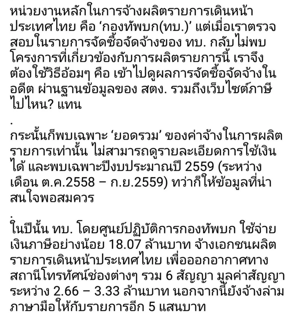 BRIEF: ค่าจ้างทำรายการ ‘เดินหน้าประเทศไทย’ ตกปีละ 18 ล้านบาท เฉลี่ยตอนละ 5 หมื่น pic.twitter.com/PTQ8gDajmQ