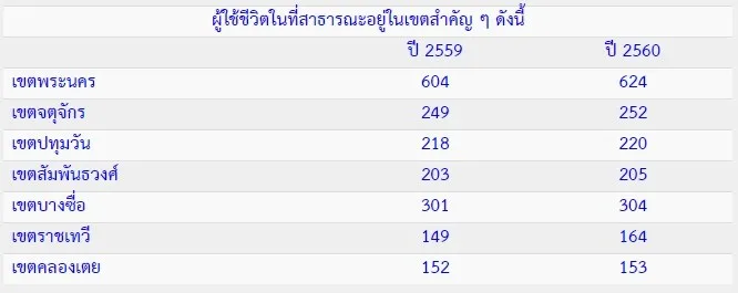 คนเร่ร่อนหรือผู้ใช้ชีวิตในที่สาธารณะ ตามที่มีการแถลงไว้ก็คือ มีคนเร่ร่อนในเขตกรุงเทพมหานครอยู่ 3,630 คน ณ สิ้นปี 2560 เพิ่มขึ้น 175 คนจากปี 2559 แยกเป็นชาย 2,203 คน และหญิง 1,427 คน คนไร้ที่พึ่งจำนวนมากเป็นผู้สูงวัยที่ใช้ชีวิตในที่สาธารณะ บางรายก็หมุนเวียนกันไป เป็นการเร่ร่อนชั่วคราวบ้าง สถานการณ์ที่พบนี้แสดงว่าปัญหาที่รุนแรงและขาดการเหลียวแลนี้ ไม่ได้เพิ่มขึ้นมากนักในช่วงปีที่ผ่านมา นับเป็นสิ่งที่ดี
