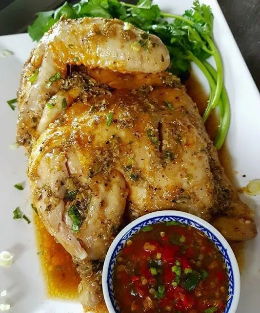 แล้วจึงนำไปหมักทาให้ทั่วไก่ แล้วแช่ตู้เย็นราวหนึ่งชั่วโมง จึงนำไปนึ่ง นึ่งน้ำเดือดไฟกลางประมาณ 45 นาที สุกแล้วโรยด้วยผักชีซอย ทานกับน้ำจิ้มสามรสและข้าวสวยร้อนๆได้เลยค่ะ