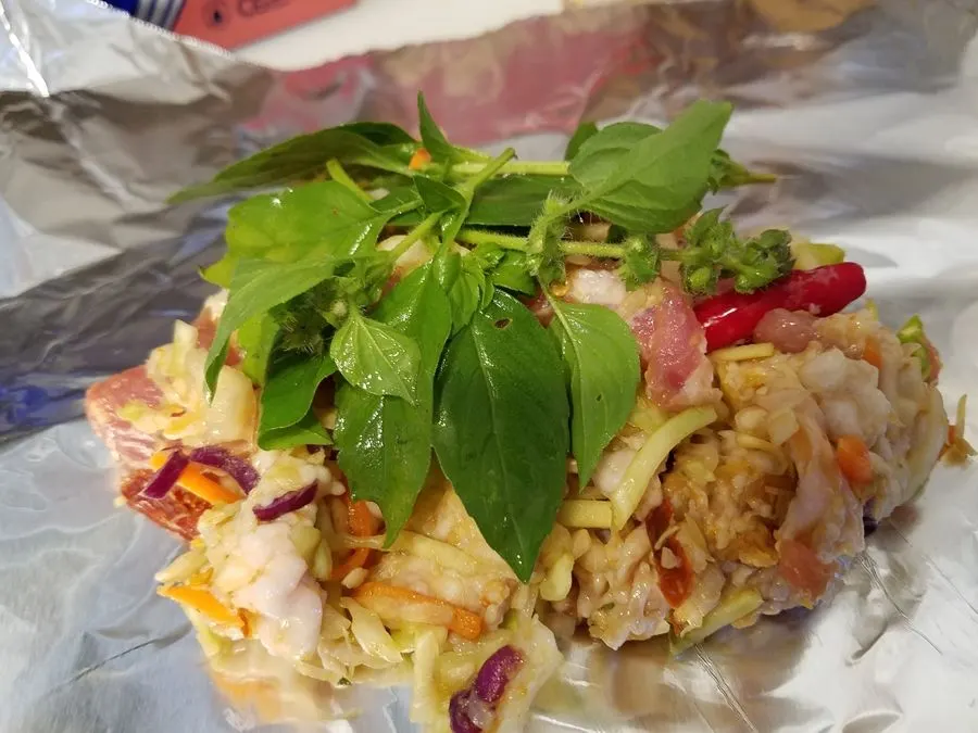 ตักใส่ใบตอง หรือฟอยส์ โรยด้วยใบแมงลัก พริกสด