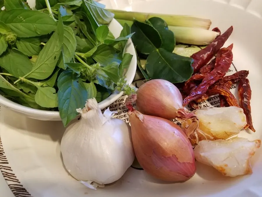 2. โขลกพริกแกงหมก พริกแห้ง ข่า ตะไคร้ หัวหอม กระเทียม พอหยาบ จากนั้นก็นำหมูกับกะหล่ำมาโขลกรวมกัน