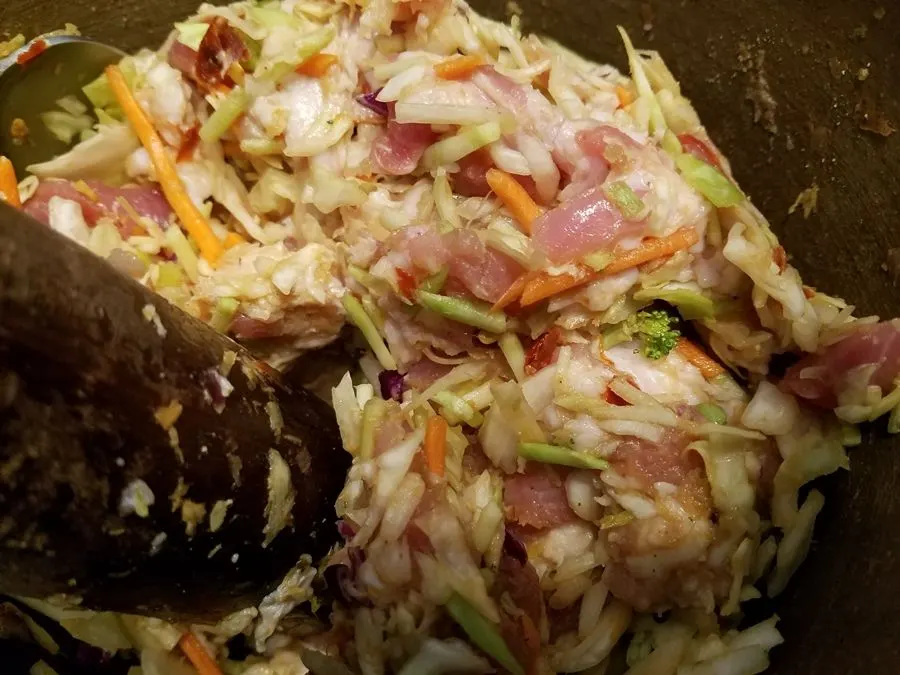 1. หั่นหมู หั่นกะหล่ำปลี ผักต่างๆ เตรียมไว้