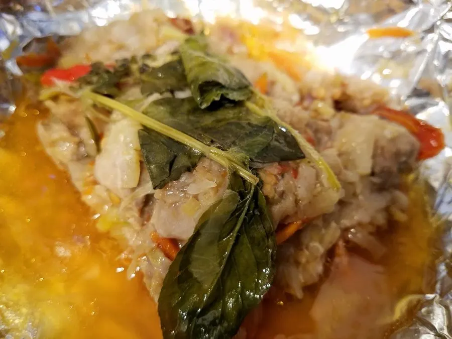 3. ตักใส่ชามเติมน้ำปลาร้า น้ำปลา ซอส เครื่องปรุง ใบมะกรูด ชิมๆ ใส่กระดาษฟอยส์ โรยด้วยใบแมงลัก พริกสด แล้วก็นำไปนึ่งคะ