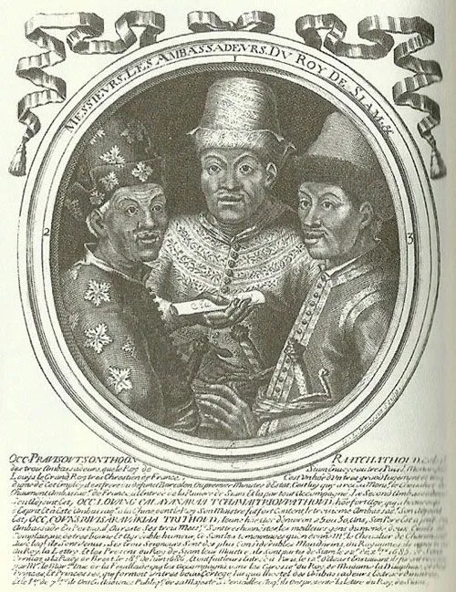 บันทึกของบาทหลวงเดอ ชัวซีย์ เขียนบันทึกเอาไว้ว่า นอกจากคณะราชทูตประกอบด้วยบุคคล 3 คนคือ ราชทูต อุปทูต และตรีทูตแล้ว ยังมีขุนนางติดตามไปในขบวนด้วยอีก 20 คน ในจำนวนนี้เป็นอักษรเลข 4 คน บรรดาศักดิ์ของขุนนางทั้งคณะคือ ออกพระ 1 คน ออกหลวง 1 คน ออกขุน 2 คน ที่เหลือคือออกหมื่น และยังมีคนรับใช้เดินทางไปด้วยอีก 20 คน