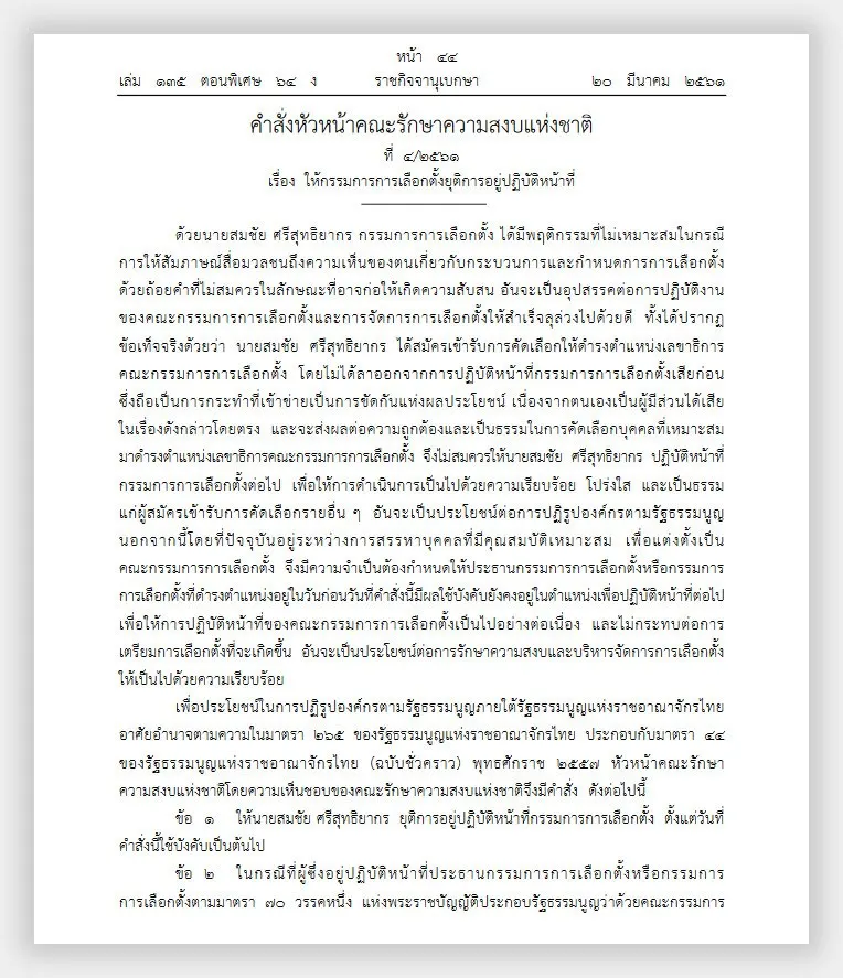 นอกจากนี้โดยที่ปัจจุบันอยู่ระหว่างการสรรหาบุคคลที่มีคุณสมบัติเหมาะสม เพื่อแต่งตั้งเป็น คณะกรรมการการเลือกตั้ง จึงมีความจําเป็นต้องกําหนดให้ประธานกรรมการการเลือกตั้งหรือกรรมการ การเลือกตั้งที่ดํารงตําแหน่งอยู่ในวันก่อนวันที่คําสั่งนี้มีผลใช้บังคับยังคงอยู่ในตําแหน่งเพื่อปฏิบัติหน้าที่ต่อไป เพื่อให้การปฏิบัติหน้าที่ของคณะกรรมการการเลือกตั้งเป็นไปอย่างต่อเนื่อง และไม่กระทบต่อการ เตรียมการเลือกตั้งที่จะเกิดขึ้น อันจะเป็นประโยชน์ต่อการรักษาความสงบและบริหารจัดการการเลือกตั้ง ให้เป็นไปด้วยความเรียบร้อย เพื่อประโยชน์ในการปฏิรูปองค์กรตามรัฐธรรมนูญภายใต้รัฐธรรมนูญแห่งราชอาณาจักรไทย อาศัยอํานาจตามความในมาตรา 265 ของรัฐธรรมนูญแห่งราชอาณาจักรไทย ประกอบกับมาตรา 44 ของรัฐธรรมนูญแห่งราชอาณาจักรไทย (ฉบับชั่วคราว) พุทธศักราช 2557 หัวหน้าคณะรักษา ความสงบแห่งชาติโดยความเห็นชอบของคณะรักษาความสงบแห่งชาติจึงมีคําสั่ง ดังต่อไปนี้