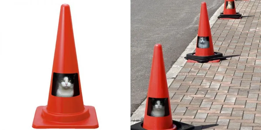 กรวยที่มีรูปแมวอยู่ เพื่อกันไม่ให้คนเดินชนกรวยเพราะคิดว่ามีแมวอยู่ข้างใน เมี้ยวๆ