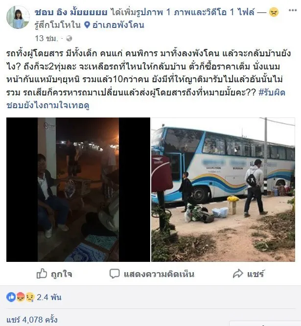 “รถทิ้งผู้โดยสาร มีทั้งเด็ก คนแก่ คนพิการ มาทิ้งลงพังโคน แล้วจะกลับบ้านยังไง? ถึงก็จะ2ทุ่มละ จะเหลือรถที่ไหนให้กลับบ้าน ตั๋วก็ซื้อราคาเต็ม นั่งแนมหน้ากันแหม๊บๆยุหนิ รวมแล้ว10กว่าคน ยังมีที่ให้ญาติมารับไปแล้วอันนั้นไม่รวม รถเสียก็ควรหารถมาเปลี่ยนแล้วส่งผู้โดยสารถึงที่หมายมั้ยคะ?? #รับผิดชอบยังไงถามใจเทอดู”