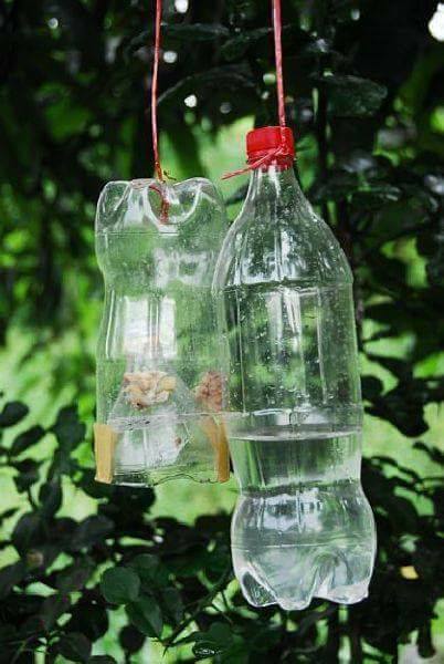 – นำขวดพลาสติกมาเจาะรูด้านข้างหรือตัดขวดตามแนวขวางประมาณ 1/4 บริเวณส่วนหัวขวด แล้วจึงนำส่วนที่ตัดแล้วสอดกลับเข้าไปในตัวขวด โดยให้ปากขวดหงายขึ้น (ดังภาพ) บริเวณก้นขวดให้เจาะรูเพื่อทำเป็นที่แขวนผูกติดกับต้นไม้