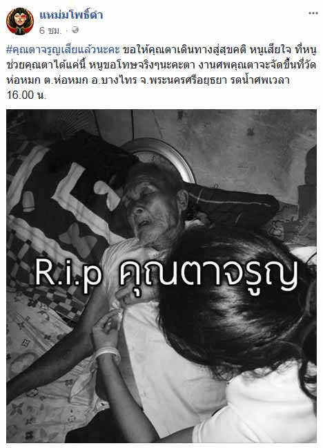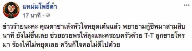 “ข่าวร้ายนะคะ คุณตาซาเล้งหัวใจหยุดเต้นแล้ว พยายามกู้ชีพมาสามสิบนาที ยังไม่ขึ้นเลย ช่วยอวยพรให้ลุงและครอบครัวด้วย T-T ลูกชายโทรมา ร้องไห้ไม่หยุดเลย ควีนก็ใจคอไม่ดีไปด้วย”