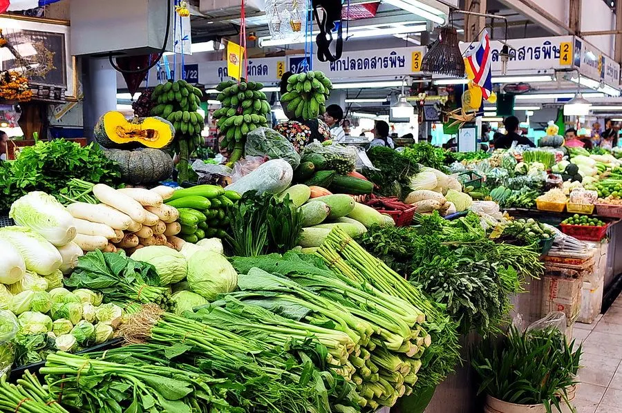 -ผักก็ถั่วฝักยาว กล่ำปลี ใบกระเพรา ที่ตลาด