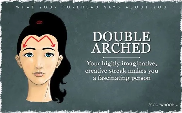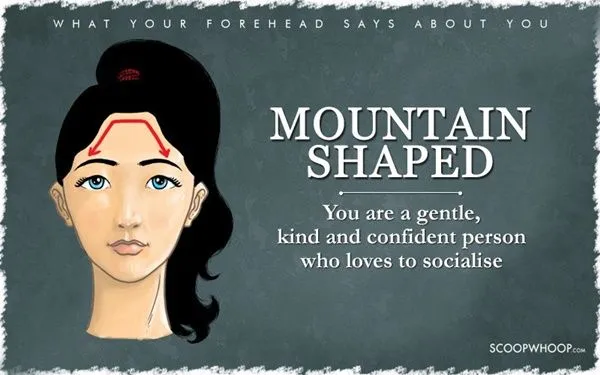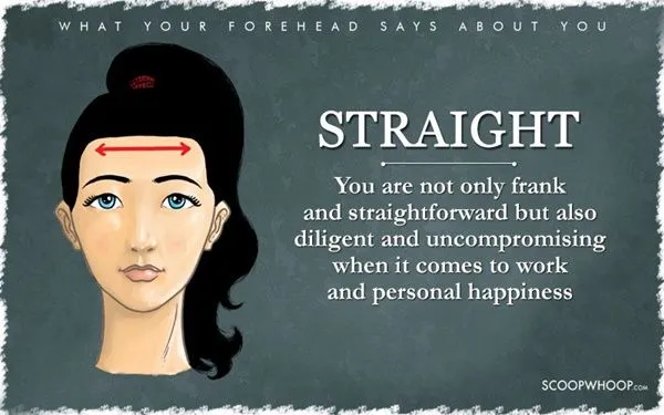 1.หน้าผากโค้ง คนที่มีหน้าผากโค้ง มักเป็นคนเปิดเผยจริงใจ นิสัยตรงไปตรงมา ไม่มีลับลมคมใน ที่สำคัญคนที่มีหน้าผากโค้งได้รูปมักโกหกไม่ค่อยเนียน จับผิดง่ายเพราะถ้ารู้สึกอะไรมักจะแสดงออกมาอย่างนั้น