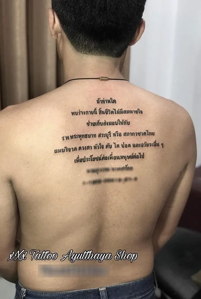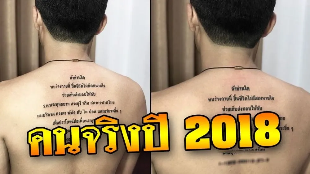 ผู้ใช้เฟซบุ๊กที่ชื่อ “Nopphadol Nakyod” ช่างสักลายได้โพสต์ภาพ ลูกค้าหนุ่มที่มาขอให้สักข้อความบริจาคร่างกายให้กับสภากาชาดไทย ที่ร้านสัก XXX Tattoo Ayutthaya จังหวัดพระนครศรีอยุธยา โดยโพสท์ข้อความบนหลังของชายหนุ่มรายนี้ ระบุว่า