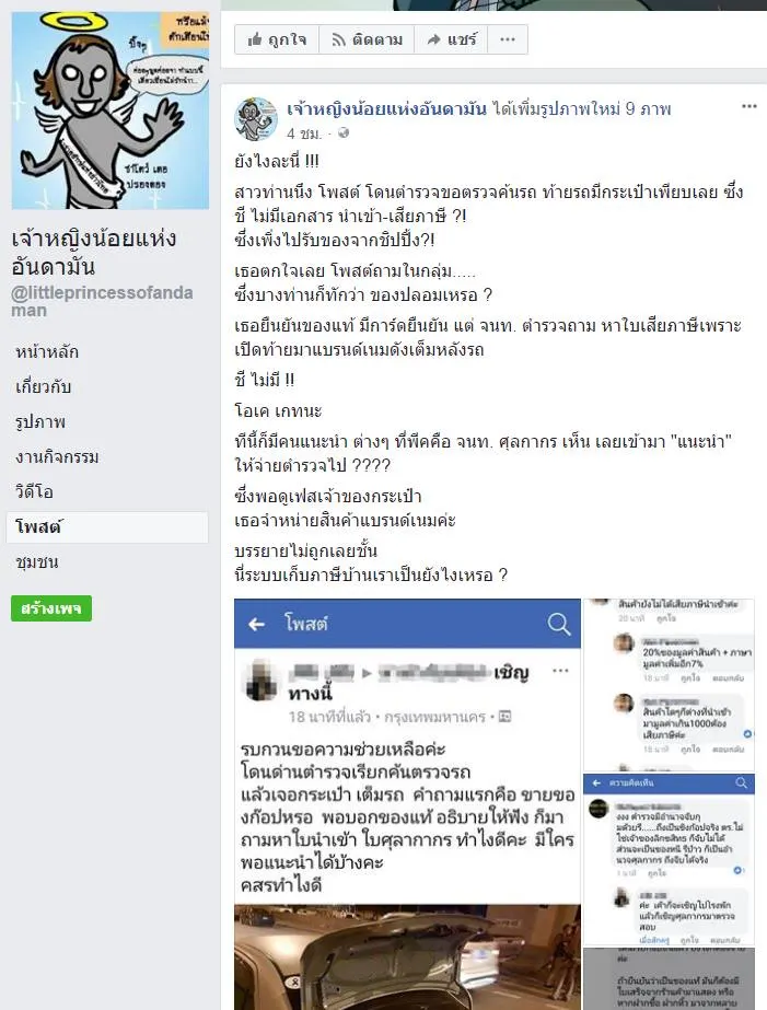 เมี่อวันที่ 4/4/2561 ทางเพจ เจ้าหญิงน้อยแห่งอันดามัน ได้โพสต์ภาพ ที่แคปมาจาก ผุ้ใช้เฟสบุ้กรายนึง ที่เป็นแม่ค้าขายของ โดยโพสต์ ขอความคิดเห็นว่าต้องทำอย่างไรดี หลังโดนตำรวจเรียกตรวจรถ แล้วเจอกระเป๋าเต็มหลังรถ ทางตำรวจสอบถามถึงเอกสารใบเสียภาษี แต่เจ้าตัวไม่มีแสดง แต่บอกของแท้ ต่อมาซึ่งก็มีชาวเน็ต เข้ามาแสดงความเห็นมากมาย ตามด้านล่าง