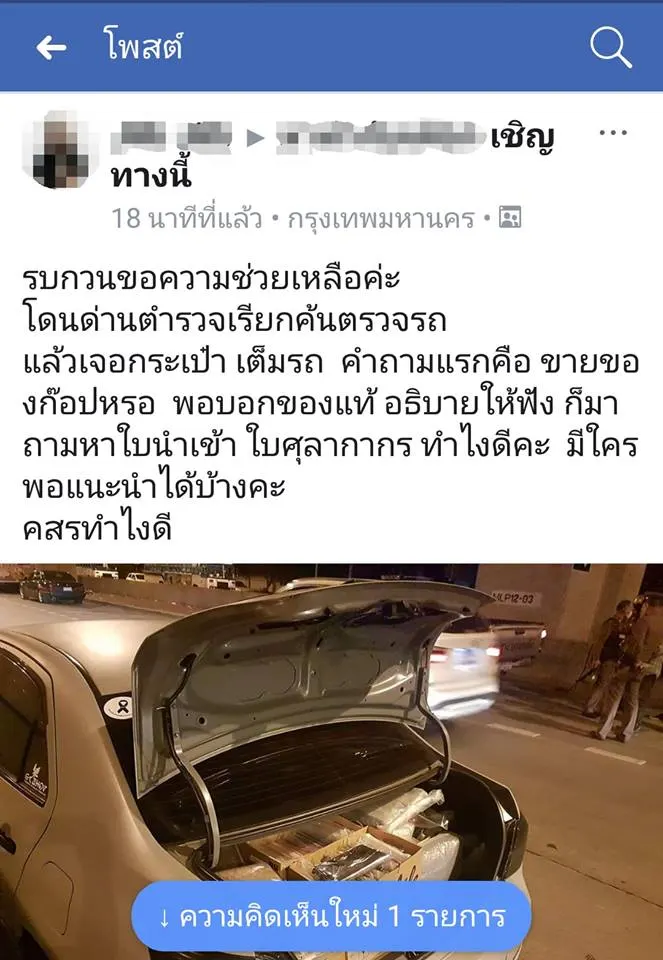 สาวท่านนึง โพสต์ โดนตำรวจขอตรวจค้นรถ ท้ายรถมีกระเป๋าเพียบเลย ซึ่ง ชี ไม่มีเอกสาร นำเข้า-เสียภาษี ?!