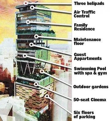 มีที่จอดรถที่สามารถจอดได้ถึง 168 คัน และยังมีลานจอดเฮลิคอปเตอร์อีก 3 ลานบนดาดฟ้า แค่โซนลอบบี้อย่างเดียวก็มีลิฟต์ 9 ตัวแล้ว