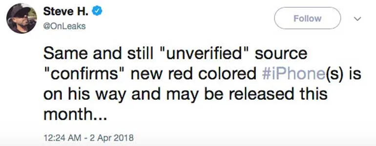 ข่าวลือดังกล่าวมาจากเจ้าพ่อข่าวหลุดคนดังอย่าง @OnLeaks ที่ได้ออกมาเผยว่าข้อมูลมาจากแหล่งข่าวที่ไม่เผยชื่อ แต่ได้ออกมายืนยันว่า iPhone 8, iPhone 8 Plus และ iPhone X สีแดง (PRODUCT)RED นั้นอาจจะวางจำหน่ายภายในเดือนนี้ โดยนี่ไม่ใช่ครั้งแรกที่ @OnLeaks พูดถึงเรื่องนี้ เพราะว่าเขาเคยให้ข้อมูลมาตั้งแต่วันที่ 23 มีนาคมมาแล้วครั้งหนึ่ง โดยว่ากันว่าข่าวนี้มีความเป็นไปได้ยู่ไม่น้อย เพราะในตอนนี้ Apple เองยังมีผลิตภัณฑ์ใหม่ที่เปิดตัวไปแล้วแต่ยังไม่พร้อมวางขายอย่าง แท่นชาร์จ AirPower และ กล่องชาร์จหูฟัง AirPods แบบไร้สาย