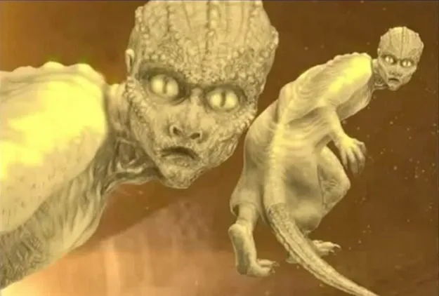 มนุษย์ต่างดาวประเภทสัตว์เลื้อยคลาน ที่มีความสามารถในการปรับเปลี่ยนรูปร่างตัวเองมาอาศัยปะปนอยู่กับสังคมมนุษย์มานานตั้งแต่ในอดีต ตามคำบอกเล่าของพยาน ลักษณะของพวกมัน มีร่างกายที่สูงถึง 7-9 ฟุต ผิวหนังมีสีเขียวและเป็นเกล็ด มีความเชื่อว่า เรปทิเลียนต้องการครอบครองโลกมนุษย์ โดยการปลอมตัวเป็นคนมีชื่อเสียงในวงการต่างๆ เพื่อสร้างอิทธิพลและชี้นำความคิดของมนุษย์อีกด้วย