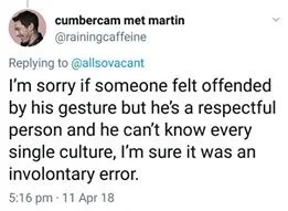 เ...้ย....ดราม่าแบบนี้แม่งมีทั่วโลกจริงๆ เฮียเบเนดิคไปเกาหลีใต้ น่าจะเตรียมโปรโมทหนังอะไรซักอย่างมั้ง infinity war ปะหว่า แล้วพอออกจากเกท แกก็ไหว้ทักทายชาวเกาหลีแบบในภาพ