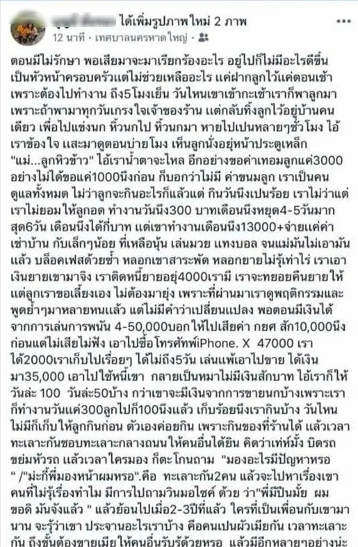 อีกอย่างขอค่าเทอมลูกแค่3000 อย่างไม่ได้ขอแค่1000นึงก่อน ก็บอกว่าไม่มี ค่าขนมลูก เราเป็นคนดูแลทั้งหมด ไม่ว่าลูกจะกินอะไรก็แล้วแต่ กินวันนึงเปนร้อย เราไม่ว่าแต่เราไม่ยอมให้ลูกอด ทำงานวันนึง300 บาทเดือนนึงหยุด4-5วันมากสุด6วัน เดือนนึงได้กี่บาท เเต่เขาทำงานเดือนนึง13000+จ่ายเเค่ค่าเช่าบ้าน กับเล็กๆน้อย ที่เหลือนุ้น เล่นมวย เเทงบอล จนแม่มันไม่เอามันเเล้ว บล็อคเฟสด้วยซ้ำ หลอกเขาสาระพัด หลอกยายไม่รุ้เท่าไร่
