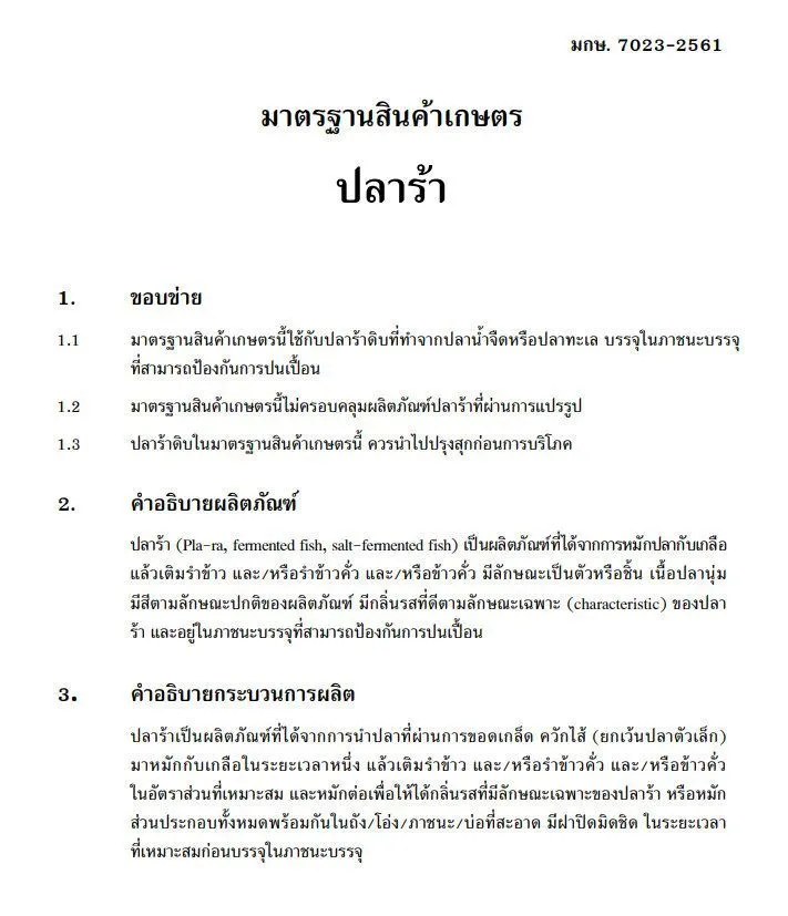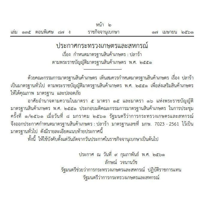 17 เมษายน 2561 เว็บไซต์ราชกิจจานุเบกษา เผยแพร่ประกาศกระทรวงเกษตรและสหกรณ์ เรื่องกำหนดมาตรฐานสินค้า : ปลาร้าตามพระราชบัญญัติมาตรฐานสินค้าเกษตร พ.ศ.2551 ซึ่งระบุว่าด้วยคณะกรรมการมาตรฐานสินค้าเกษตรเห็นสมควรกำหนดมาตรฐานสินค้าเกษตร เรื่องปลาร้าเป็นมาตรฐานทั่วไปตาม พ.ร.บ.มาตรฐานสินค้าเกษตร 2551 เพื่อส่งเสริมสินค้าเกษตรให้ได้คุณภาพ มาตรฐาน และปลอดภัย อาศัยอำนาจตามความในมาตรา 5 มาตรา 15 และมาตรา 16 แห่งพ.ร.บ.มาตรฐานสินค้าเกษตร พ.ศ.2551 ประกอบมติคณะกรรมการมาตรฐานสินค้าเกษตร ในการประชุมครั้งที่ 1/2561 เมื่อวันที่ 8 ม.ค.2561 รมว.เกษตรและสหกรณ์จึงออกประกาศกำหนดมาตรฐานสินค้าเกษตร : ปลาร้า มกษ. 7023-2561 ไว้เป็นมาตรฐานทั่วไป