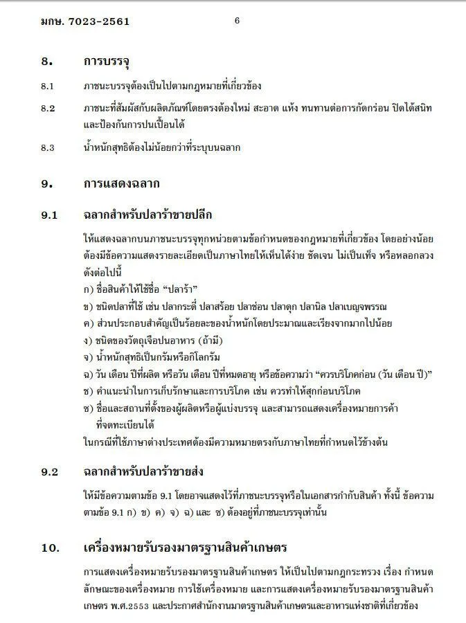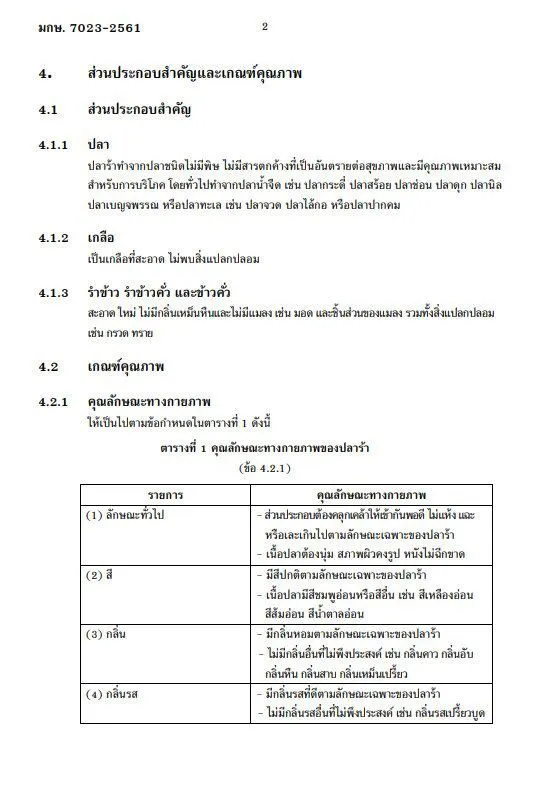เกี่ยวกับปลาร้าระบุตั้งแต่คำอธิบาย กระบวนการผลิต ส่วนประกอบและเกณฑ์คุณภาพ ซึ่งประกอบด้วยคุณลักษณะทางกายภาพที่ต้องคลุกเคล้ากันพอดี ไม่แห้งหรือเละเกินไป เนื้อปลานุ่ม หนังไม่ฉีกขาด มีสีตามลักษณะเฉพาะของเนื้อปลา กลิ่นหอมตามลักษณะเฉพาะของปลาร้า ไม่มีกลิ่นคาว เหม็นอับ เหม็นเปรี้ยว