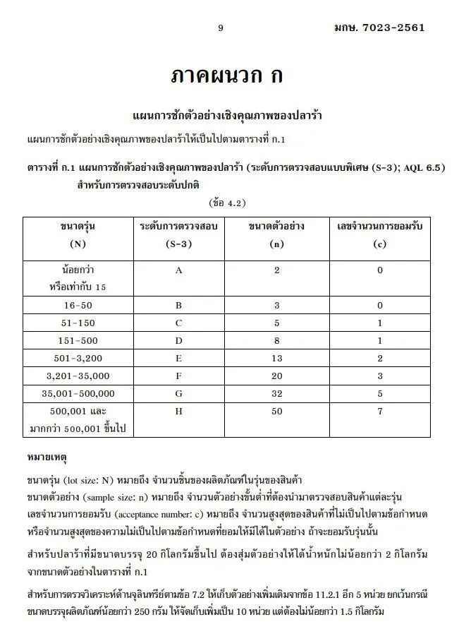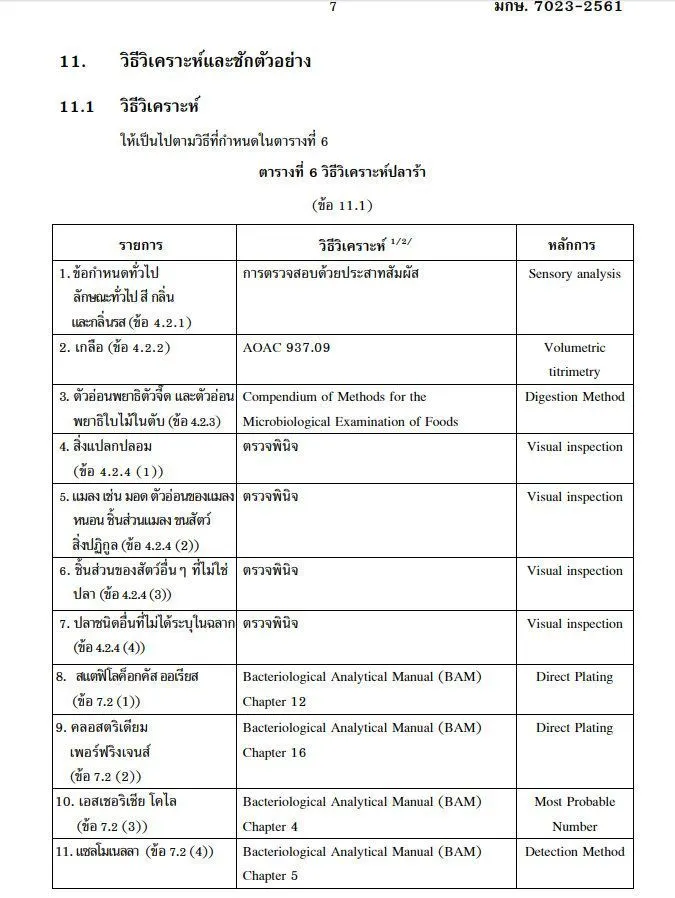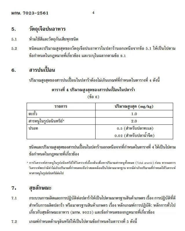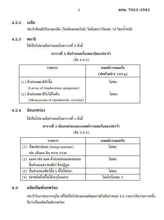 การใส่เกลือ ต้องไม่น้อยกว่าร้อยละ 18 โดยน้ำหนัก ไม่พบพยาธิตัวจี๊ดและตัวอ่อนพยาธิใบไม้ในตับ ไม่มีสิ่งแปลกปลอม แมลง ชิ้นส่วนสัตว์ที่ไม่ใช่ปลา และปลาที่ไม่ได้บรรจุในฉลาก ห้ามใช้สีและวัตถุกันเสีย สารปนเปื้อนต้องไม่เกินเกณฑ์ที่กำหนดhttp://www.ratchakitcha.soc.go.th/DATA/PDF/2561/E/087/2.PDF