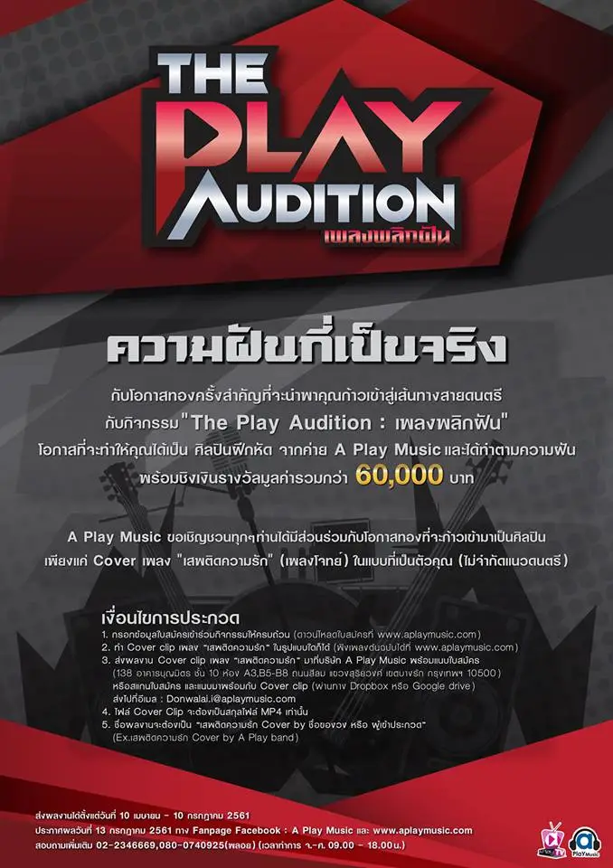 ความฝันที่เป็นจริง!!! กับโอกาสทองครั้งสำคัญ ที่จะนำพาคุณก้าวเข้าสู่เส้นทางสายดนตรีกับกิจกรรม "The Play Audition: เพลงพลิกฝัน" โอกาสที่จะทำให้คุณได้เป็น ศิลปินฝึกหัด จากค่าย A Play Music และได้ทำตามความฝัน พร้อมชิงเงินรางวัลมูลค่ารวมกว่า 60,000 บาท!!!!!