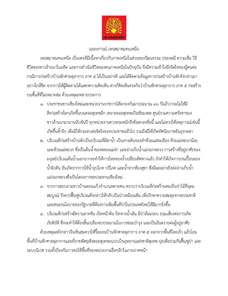 แถลงการณ์ เพจสมาคมคนเหนือ กรณี ขอคืนพื้นที่ป่าดอยสุเทพ