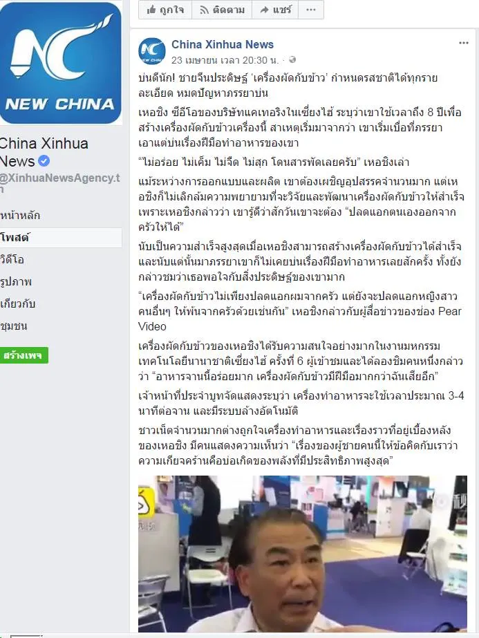 “เครื่องผัดกับข้าวไม่เพียงปลดแอกผมจากครัว แต่ยังจะปลดแอกหญิงสาวคนอื่นๆ ให้พ้นจากครัวด้วยเช่นกัน” เหอชิงกล่าวกับผู้สื่อข่าวของช่อง Pear Video