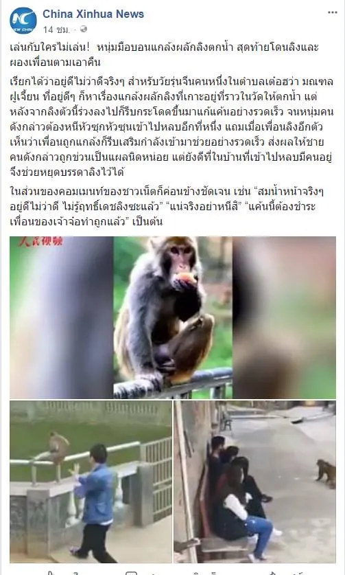 เรียกได้ว่าอยู่ดีไม่ว่าดีจริงๆ สำหรับวัยรุ่นจีนคนหนึ่งในตำบลเต๋อฮว่า มณฑลฝูเจี้ยน ที่อยู่ดีๆ ก็หาเรื่องแกล้งผลักลิงที่เกาะอยู่ที่ราวในวัดให้ตกน้ำ แต่หลังจากลิงตัวนี้ร่วงลงไปก็รีบกระโดดขึ้นมาแก้แค้นอย่างรวดเร็ว จนหนุ่มคนดังกล่าวต้องหนีหัวซุกหัวซุนเข้าไปหลบอีกที่หนึ่ง แถมเมื่อเพื่อนลิงอีกตัวเห็นว่าเพื่อนถูกแกล้งก็รีบเสริมกำลังเข้ามาช่วยอย่างรวดเร็ว ส่งผลให้ชายคนดังกล่าวถูกข่วนเป็นแผลนิดหน่อย แต่ยังดีที่ในบ้านที่เข้าไปหลบมีคนอยู่จึงช่วยหยุดบรรดาลิงไว้ได้