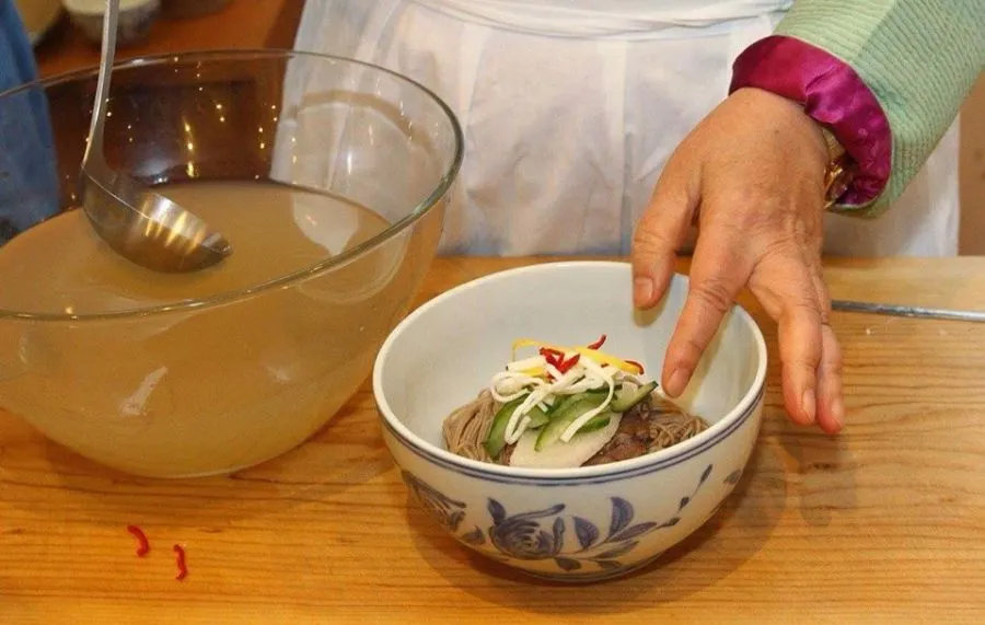 ส่วนบะหมี่เย็นตำรับเปียงยางที่ถูกเสิร์ฟขึ้นโต๊ะงานเลี้ยงฯ ช่วงค่ำคืนวันศุกร์นั้นเป็นฝีมือการปรุงของพ่อครัวจากภัตตาคารชื่อดัง (Okryugwan) ในกรุงเปียงยาง ที่ยกย้ายอุปกรณ์ทั้งหมดมาตั้งเตาปรุงบะหมี่เย็น ณ อาคารตงกิลกัก หมู่บ้านพันมุนจอม ฝั่งเกาหลีเหนือ