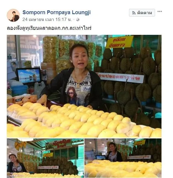 คลิปแม่ค้าขายทุเรียนที่ตลาด องค์การตลาดเพื่อเกษตรกร เป็นแผงทุเรียนที่มีการปอกเปลือกเรียบร้อย โดยได้ถามราคากิโลละเท่าไหร่ แม่ค้าก็ตอบว่ากิโลละ 3,000 บาท 2,000 บาท และ 1,000 บาท มี่ทั้งหมด3 เรต